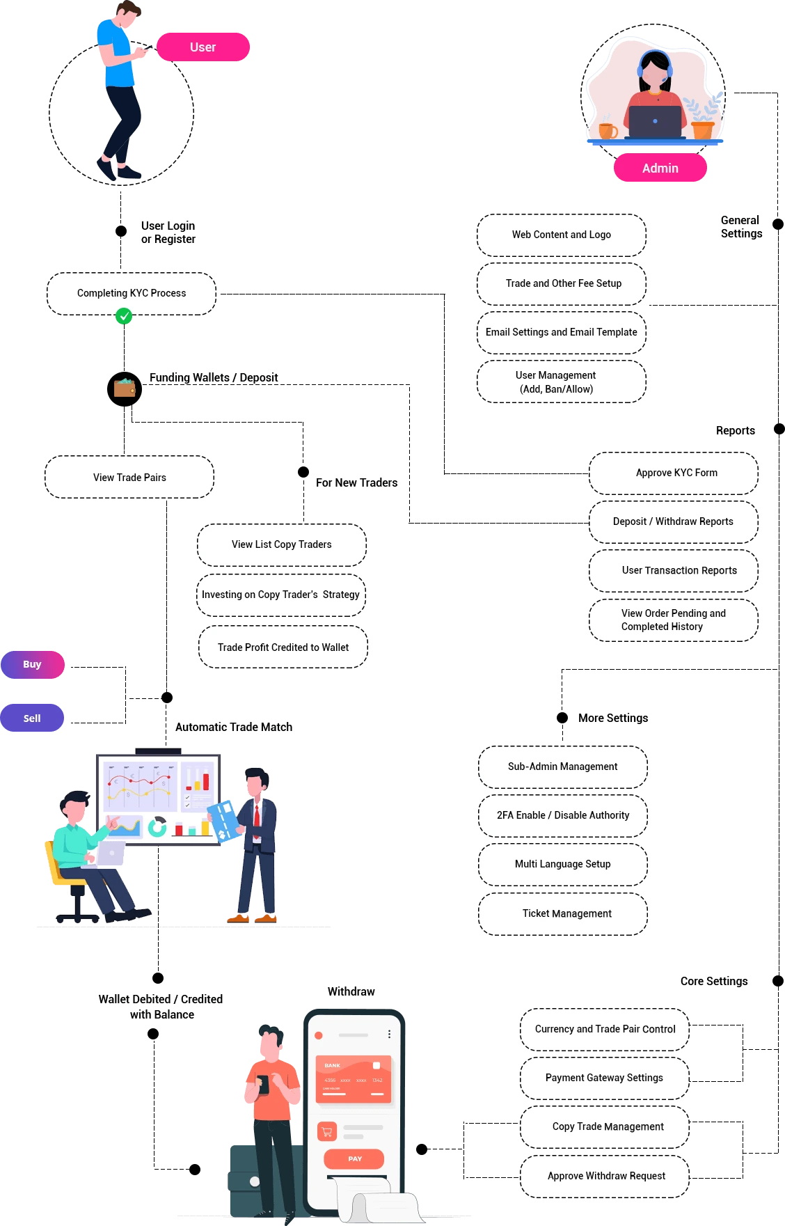 Our cryptocurrency exchange script is designed to simplify the launch and operation of your own trading platform. The flowchart below illustrates how the script powers key processes such as user registration, wallet integration, order matching, and admin control. With our ready-made solution, you get a streamlined, secure, and scalable system built to support efficient and seamless crypto trading.